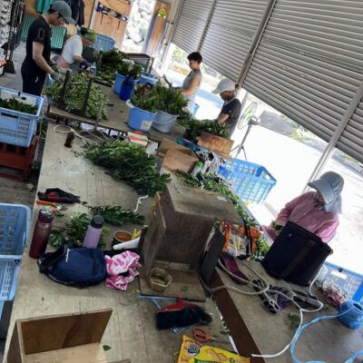 収穫後は専用冷蔵庫で鮮度管理し、品質を保つために特別なフィルムに入れて全国へ発送。榊農家直送だからこそ、張りのある瑞々しい“生の榊”をそのままお届けできます。